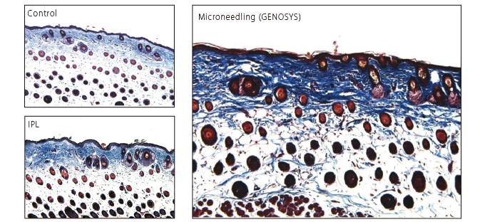 マイクロニードル(微細針)による微細出血から血小板が自動的に生成され通常の炎症プロセスが開始されます。この現象により、成長因子の正常な心的外傷後の分泌と繊維細胞の浸潤作用が促進され、より多くのコラーゲンとエラスチンを生成します。
